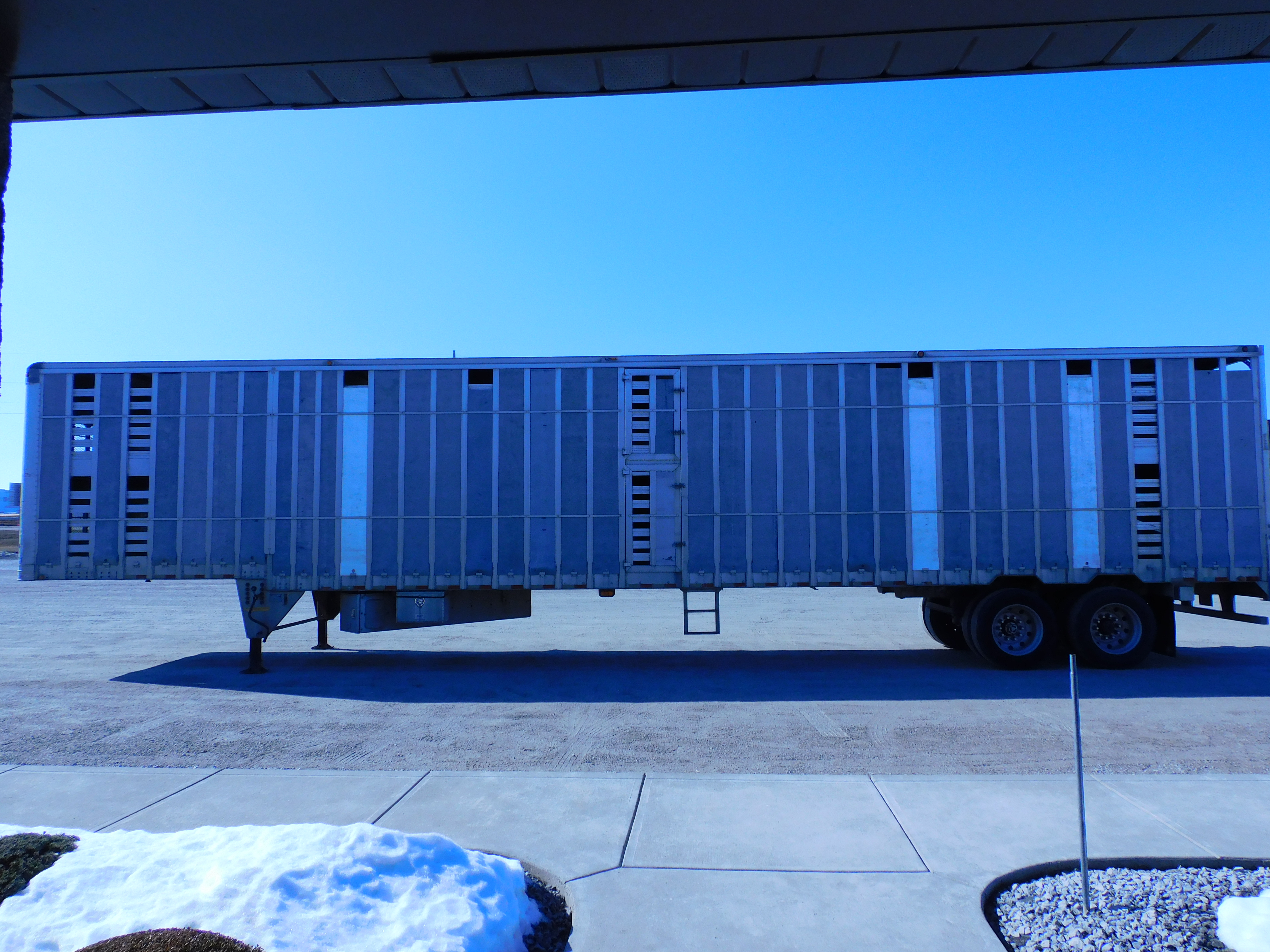 2003 EBY Double Deck Slat Side Livestock Trailer, 53'x 102'', Air Ride Suspension, Aluminum Subframe, Drum Brakes, (8) Aluminum Wheels On 285/75R22.5 Tires, Rear Roll Up Door, D/S Access Doors, (2) Rows Of (8) Lights, Winter Kit, Toolbox, (3) Cut Gates Top/Bottom, Suspension Dump, Inside Lights.