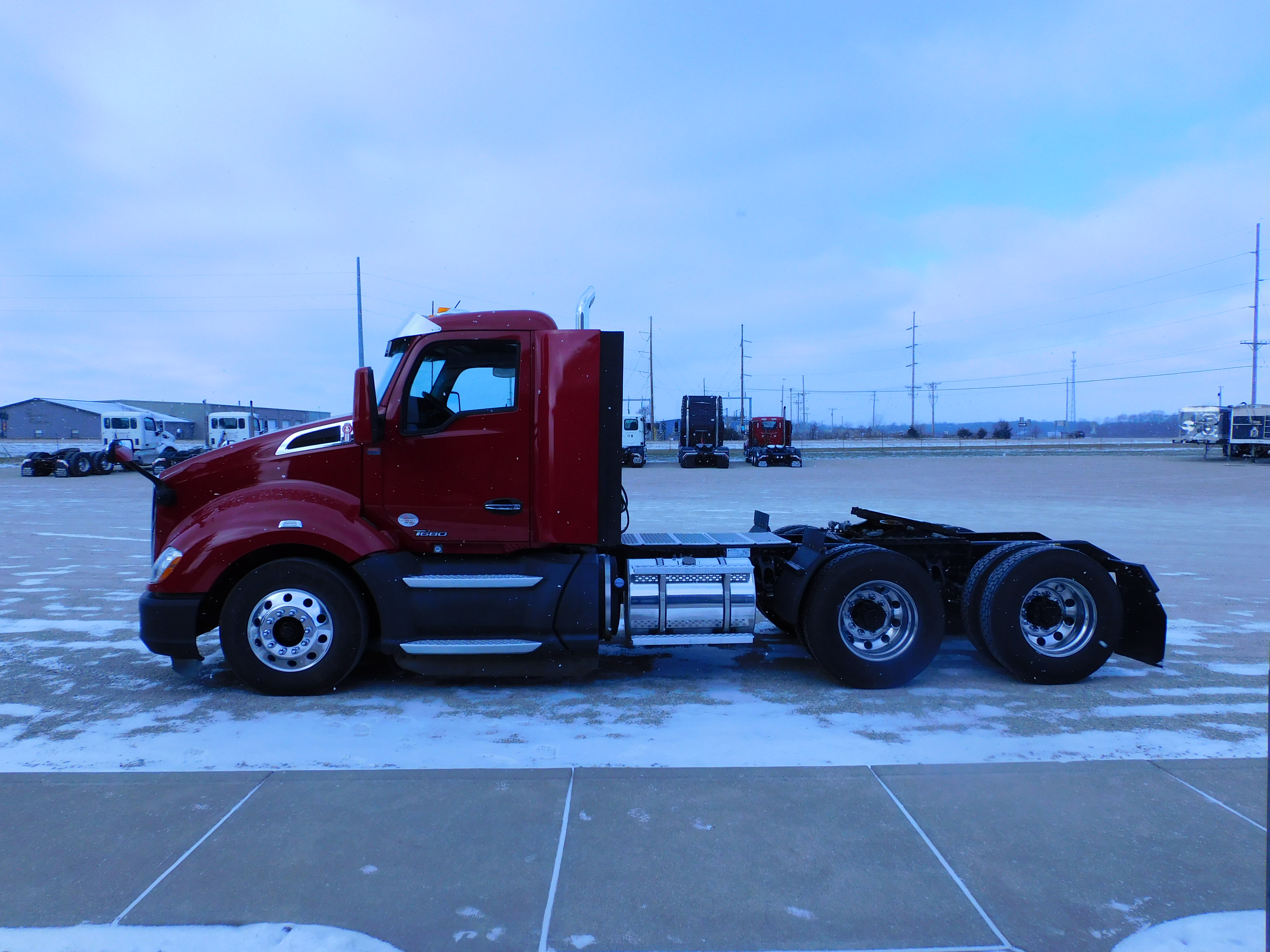 2021 Kenworth T680 Tandem Axle Daycab Tractor, Paccar MX-13 455 Hp Motor, Eaton Endurant 12 Speed Automatic Transmission, Air Ride, 191'' WB, 2.79 RR, (2) Alum 75 Gallon Fuel Tanks, Drum Brakes, (10) Aluminum Wheels On 295/75R22.5 Virgin Tires, Jake, Cruise, AM/FM, PDL, Suspension Dump Valve, Power Locks, Windows, Mirrors/Heated, Air Slide 5'th Wheel, Vertical Exhaust, Tilt/Tele Wheel, (1) A/R Seat, Serviced, Detailed & DOT Inspected.