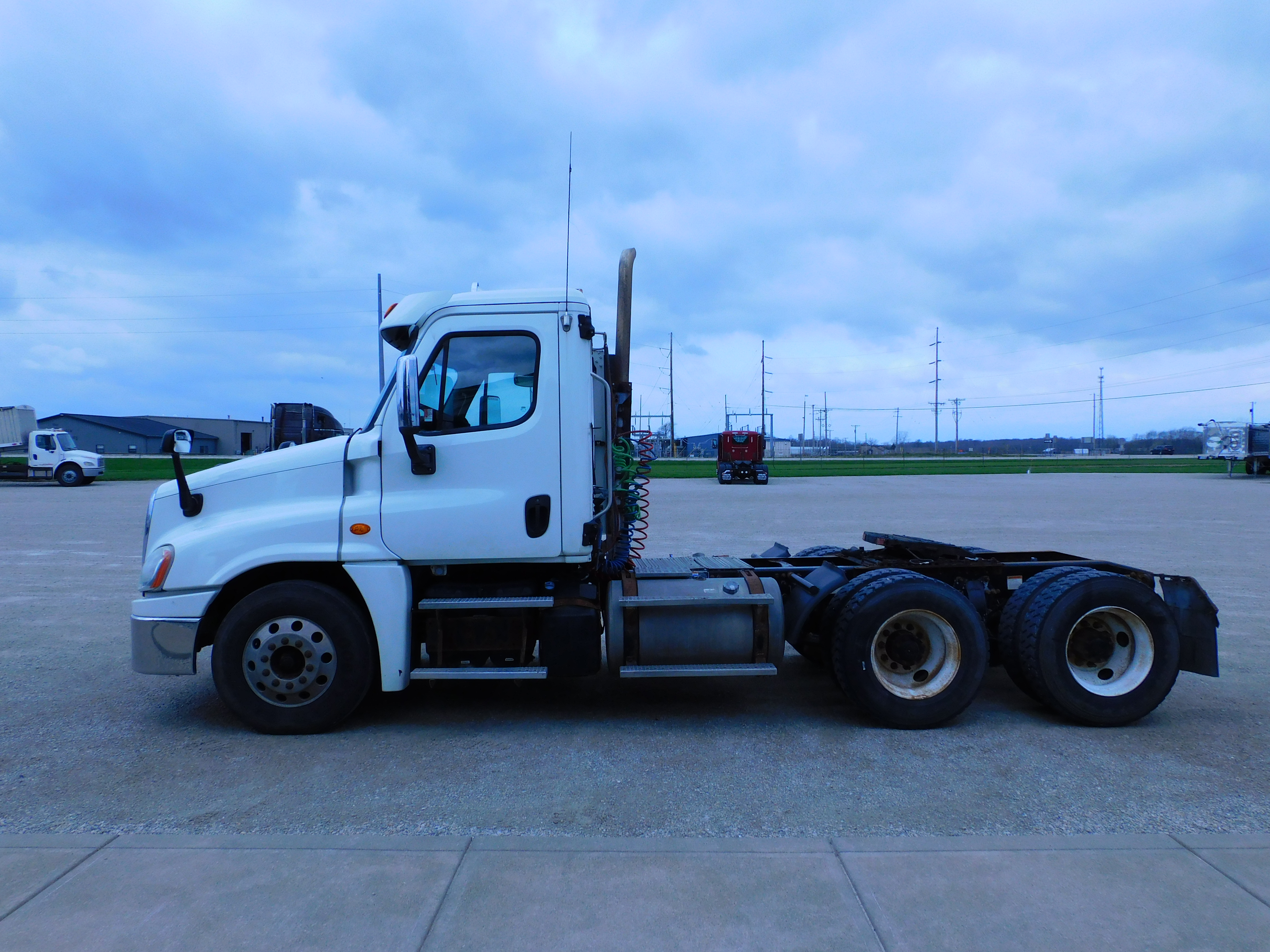 2013 Freightliner Cascadia 125 Tandem Axle Daycab Tractor, Cummins ISX 485 Hp Motor, Eaton Fuller 10 Speed Manual Transmission, Air Ride, 40K RA, 12K FA, 184'' WB, 3.55 RR, (2) Alum. 90 Gallon Fuel Tanks, Drum Brakes, (2) Alum. Steer Wheels & (8) Steel Drive Wheels On 295/75R22.5 Tires, Jake, Cruise, AM/FM, PDL, Suspension Dump Valve, Power Locks, Windows, Mirrors/Heated, A/S 5'th Wheel, Vertical Exhaust, (2) A/R Seats.